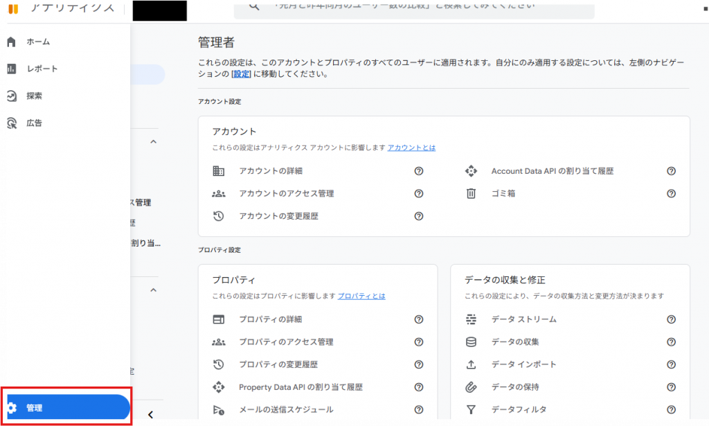 画面左側のメニュー下の「⚙ 管理」メニューをクリックします。