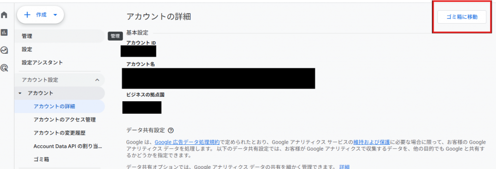 - 不要になったアカウントは「管理」→「アカウント設定」→「ゴミ箱に移動」で削除