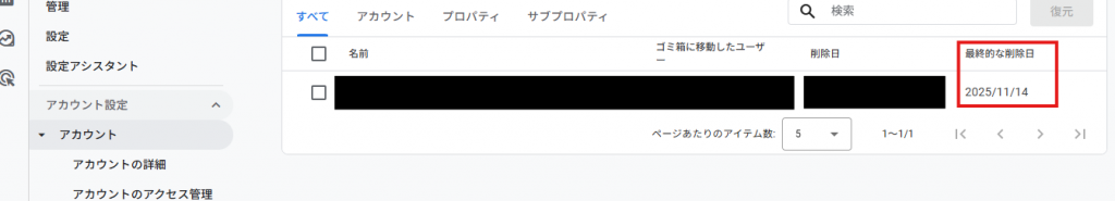 - ゴミ箱にある削除済みアカウント一覧から、復元したいアカウントにチェックを入れる