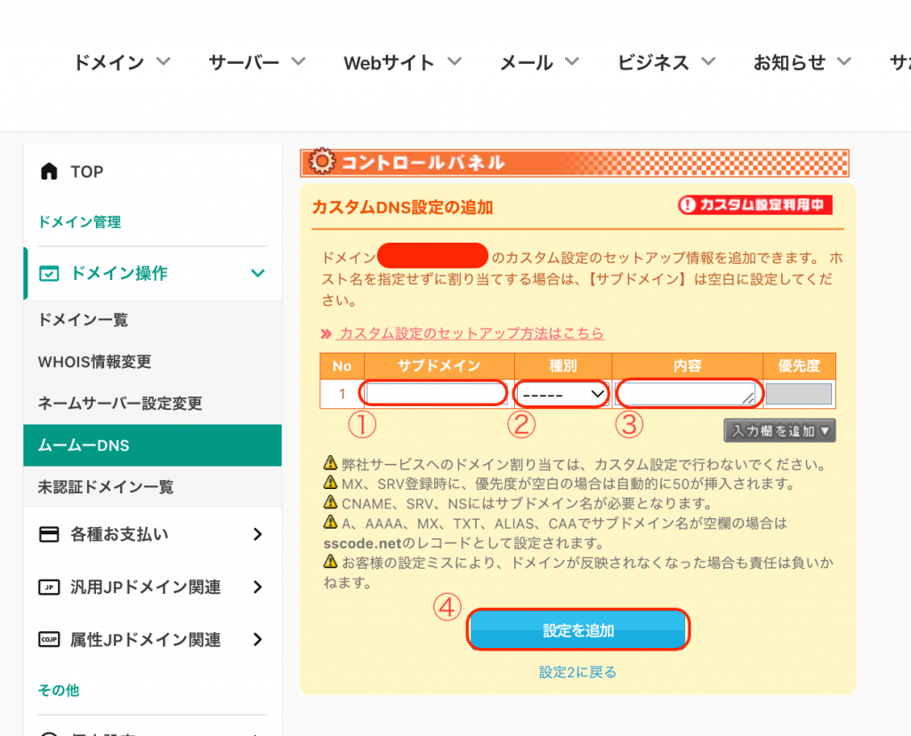 サブドメインの設定方法(ムームードメイン)